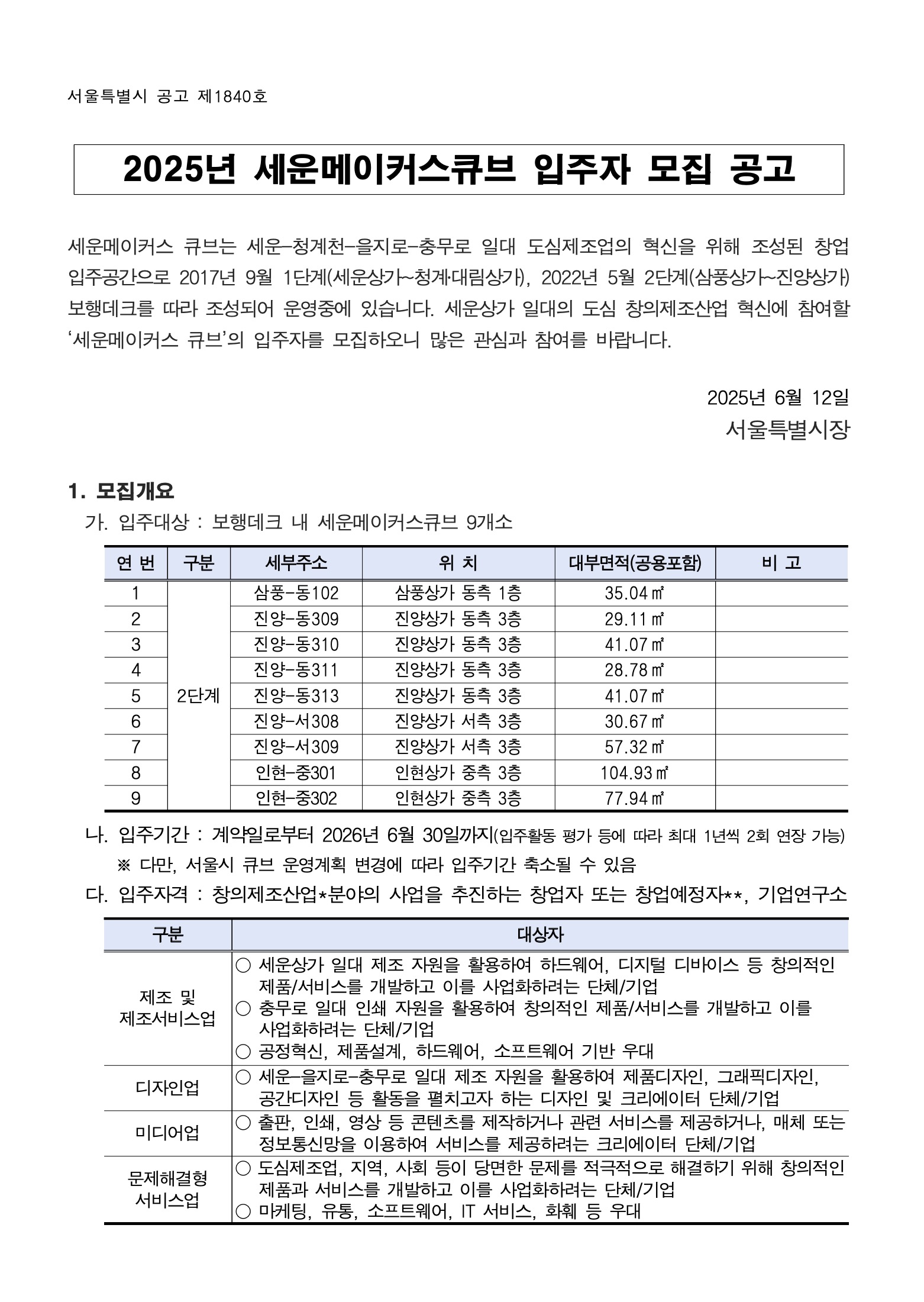 [모집]2025년 세운메이커스큐브 입주사 모집 공고