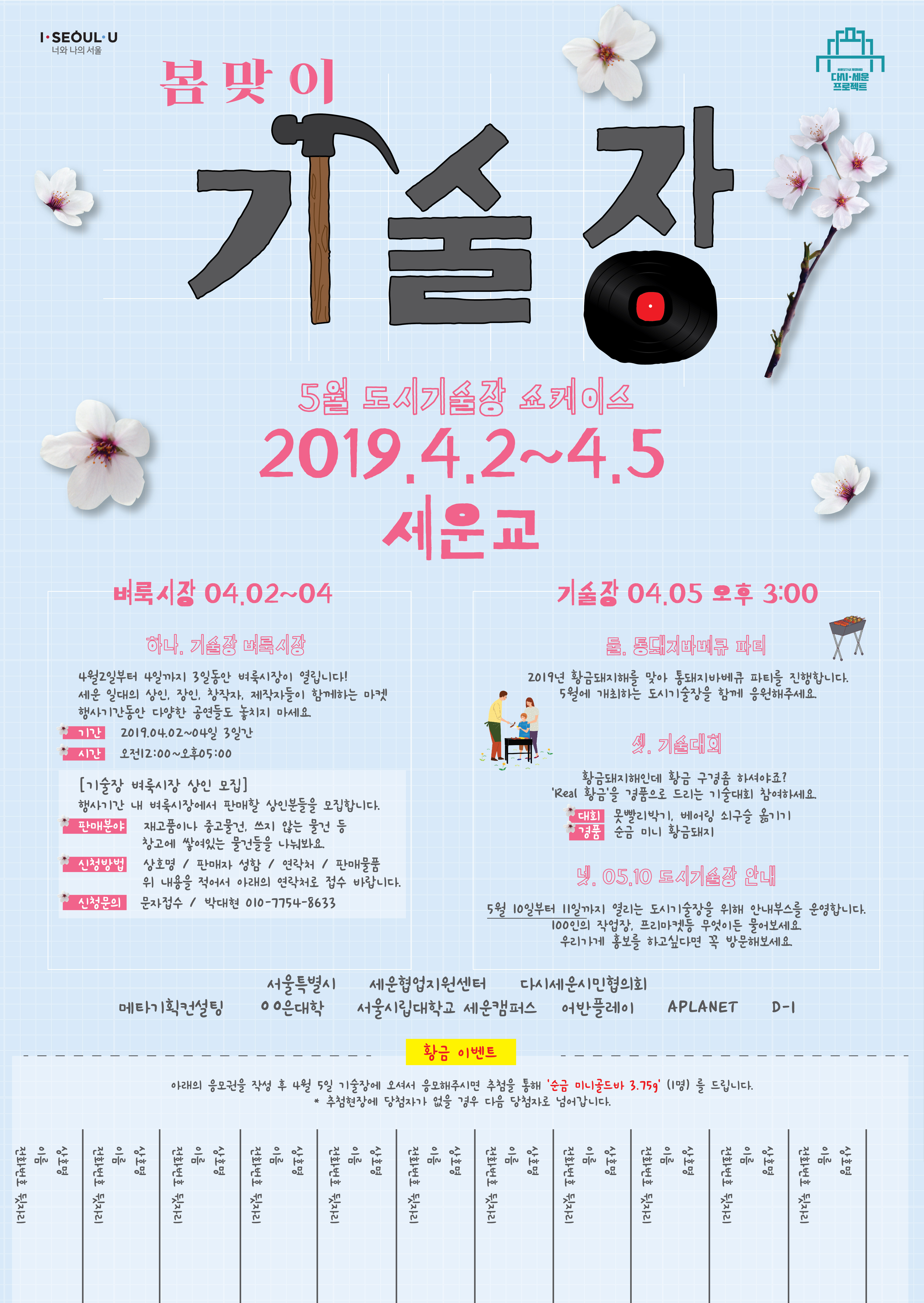세운상가 일대 활성화를 위한 '도시기술장' 행사가 5월10일~11일 까지 세운상가군에서 열립니다. 본 행사에 앞서 사전행사로 지역 상인분들과 소통하는 자리를 4월2일~4월5일 까지 만들 예정입니다. 여러분의 많은 관심 부탁 드립니다. 1. 벼룩시장 날짜 : 4월2일~4월4일 3일간 장소 : 세운교 시간 : 11시~5시 2.기술장쇼케이스 날짜 : 4월5일 장소 : 세운교 시간 : 3시~6시 문의 :